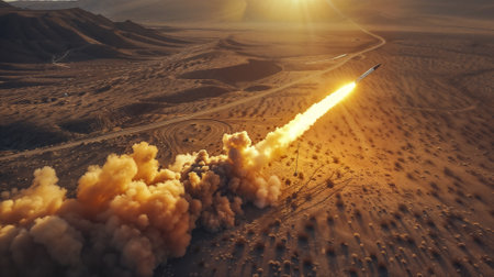 Soaring missile trails fire and smoke against a dusky desert backdrop