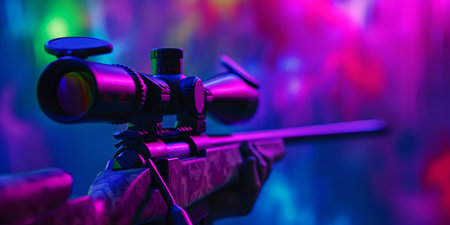 A striking sniper rifle scope is beautifully highlighted against a vibrant and colorful backdrop that captivates