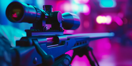 A detailed view of a sniper rifle in a vibrant neon-lit environment, capturing the essence of tactical gear.