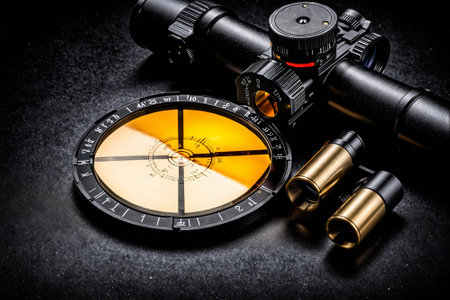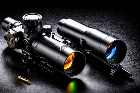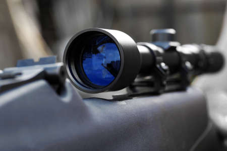closeup of telescopic sight with reflection in lens mounted on rifle for sniper shooting