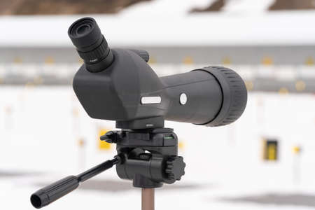 Close-up view of professional sports monocle Leupold looking at shooting range of biathlon stadium. Regional Junior biathlon competitions East Cup. Kamchatka Peninsula, Russian Far East - Apr 12, 2019