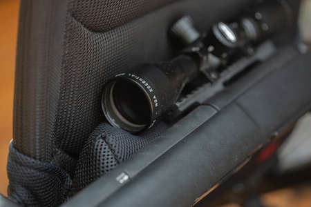 Optical sight of a sniper rifle close-up. Black optical sight