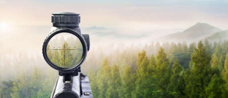 Sniper rifle scoping target view. Gun scope at forest.