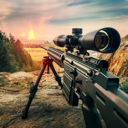 A long-range rifle rests on a rocky outcrop, overlooking a stunning mountain vista during dusk. The calm landscape showcases vibrant colors and serene beauty, perfect for nature enthusiasts and adventure seekers.