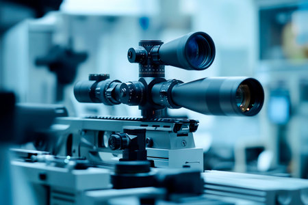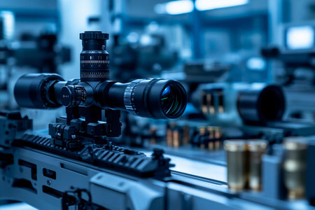Close-up of a high-tech rifle scope mounted on a firearm in a modern workshop, showing intricate details and advanced optics in a professional setting.