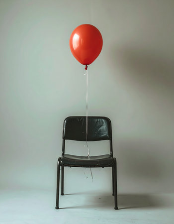 A single red balloon, full of life and potential, is tethered to an empty black chair.