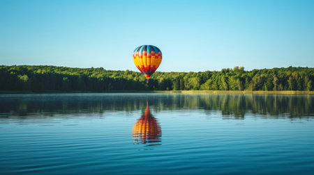 Hot Air Balloon Hovering Over a Calm Lake with Green Landscape and Reflection. Concept of Adventure, Tranquility, Nature, Outdoor Activity.