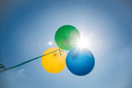 three colored helium balloons fly to the sky, the sun shines through the balloons, the flight of balloons against the blue sky.