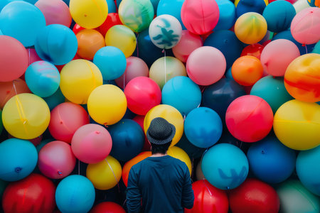 Rear view of a person contemplating a vibrant display of colorful balloons