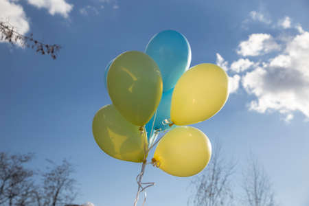 light yellow and blue helium balloons fly in the sky. color of flag of Ukraine. Illusory hopes for happiness during military operations on territory of Ukraine. symbol of freedom and joy for Ukrainians