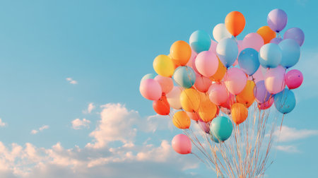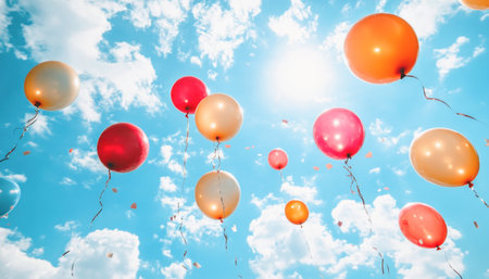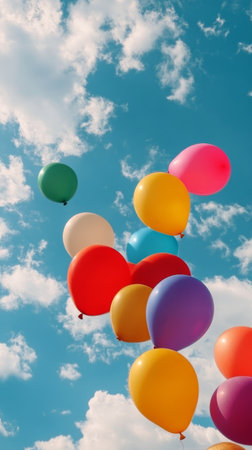 Colorful balloons float against bright sky, creating joyful and festive atmosphere. vibrant hues of yellow, red, blue, and pink add sense of celebration and happiness to scene