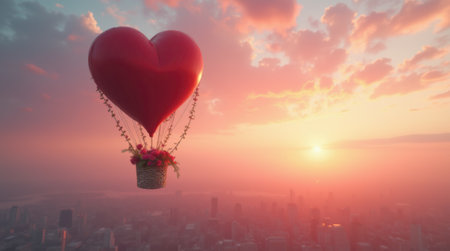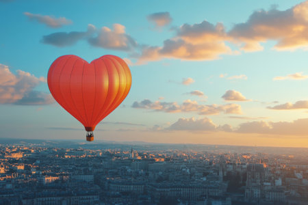 A heart-shaped hot air balloon flies over the city against the blue sky. background with place for text for valentine's day.