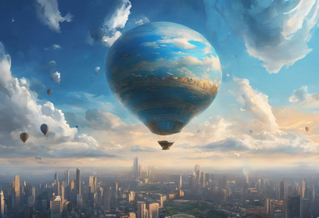 Giant hot air balloon, reflecting a cityscape, majestically floats above a sprawling futuristic metropolis under a cloudy sky