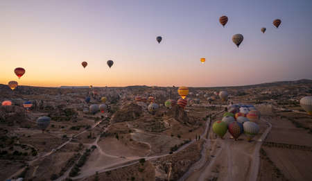 Cappadocia, Turkey - September 14, 2021: Wide angle aerial panoramic shot of colorful hot air balloons together floating in the sky at early morning sunrise horizon in Goreme national park