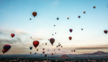 Hot air balloon flying over Teotihuacan pyramids complex located in Mexican Highlands and Mexico Valley close to Mexico City. Mexico