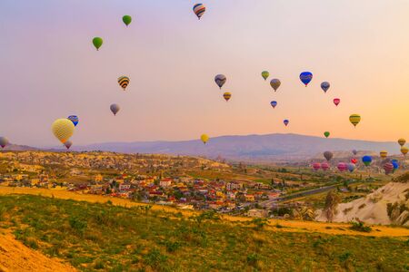 Sunrise panoramic view to Goreme city and flying balloons over pigeon valley Cappadocia, Turkey