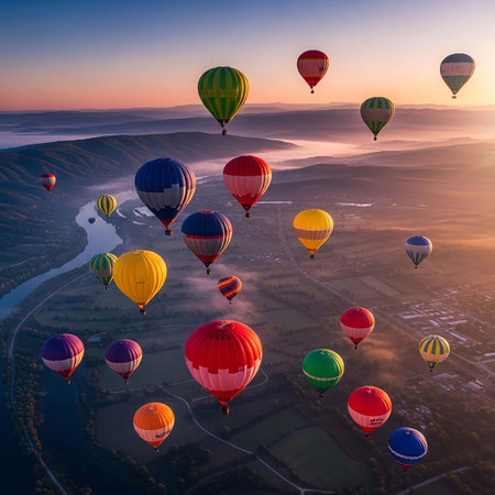 Aerial view of hot air balloons over a valley at sunrise. Misty mountains and lush landscapes