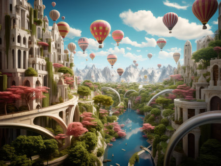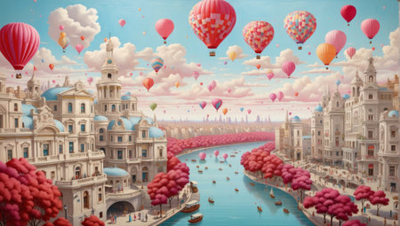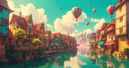Fantasy cityscape with colorful hot air balloons flying in the sky over a river and beautiful buildings.