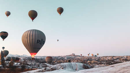 Colorful Hot Air Balloons flying over Cappadocia early morning in winter in Turkey