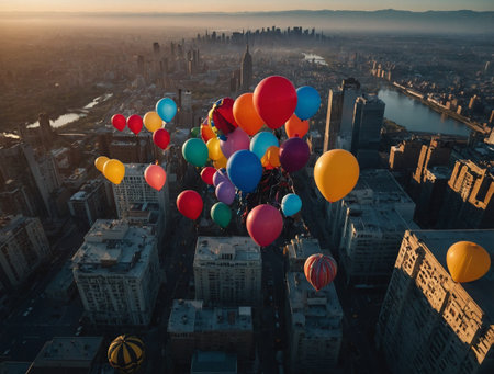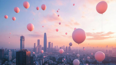 Colorful balloons float gracefully above a bustling modern city, illuminated by the warm hues of sunset in the background.