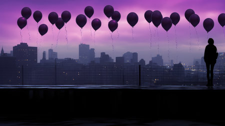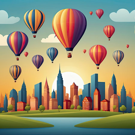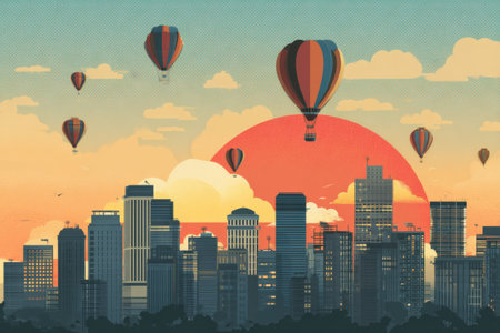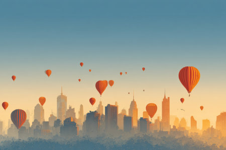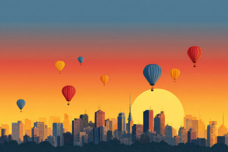 Colorful Balloons Over City Silhouette at Sunset, Advert Style