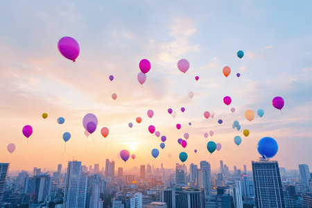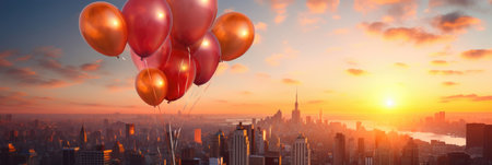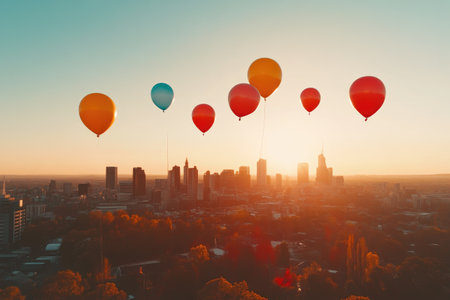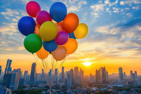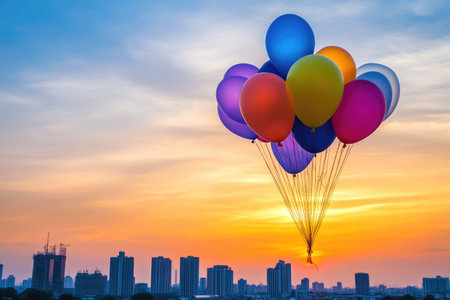 Bright Balloons Against Sunset City Skyline with Clean Background