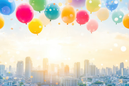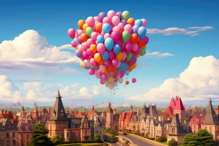 Brightly colored balloons drift above a lively urban skyline, creating a cheerful contrast against the blue sky and clouds.