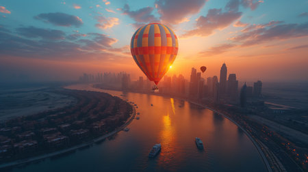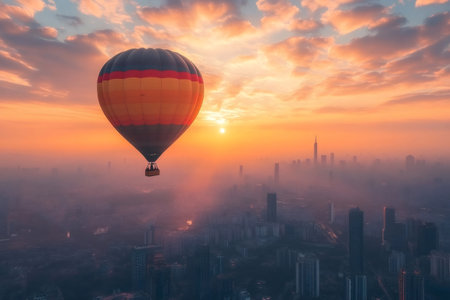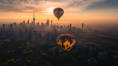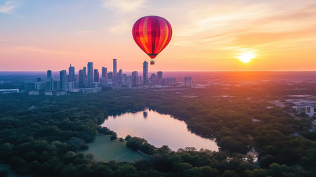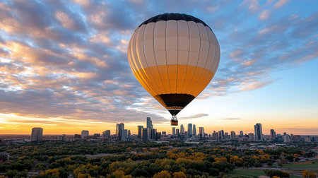 A hot air balloon floats over city skyline at sunset, creating stunning view