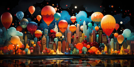 A painting of balloons floating over a city at night.