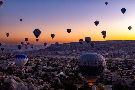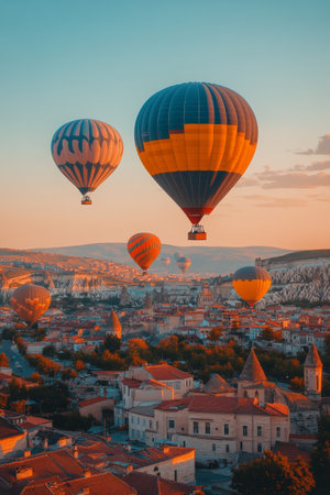 Hot air balloons rise above the unique rock formations of Cappadocia at dawn. The colorful balloons create a stunning visual contrast against the early morning sky and landscape.