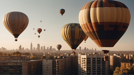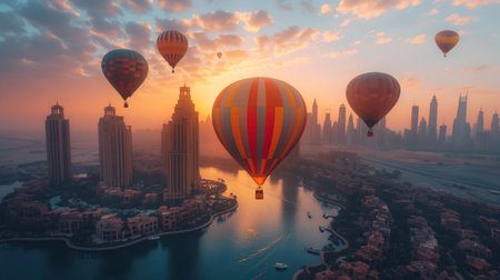 Colorful hot air balloons fill the sky as the sun rises, casting golden light on the city skyline, blending tranquility with the bustling energy of urban life.