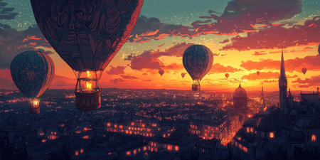 Whimsical hot air balloons gracefully float above a captivating cityscape bathed in the warm glow of a breathtaking sunset This digital showcases a serene and enchanting scene