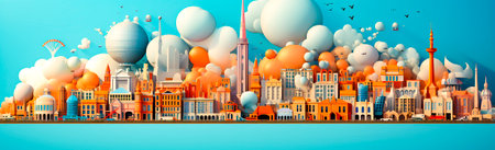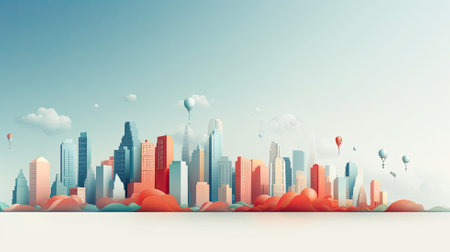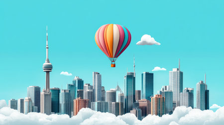 A vibrant hot air balloon floats above a modern city skyline, presenting an eye-catching contrast against a bright blue sky and fluffy clouds. Perfect for travel themes.