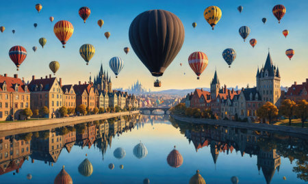 Hot air balloons soar over a picturesque European city, casting reflections on the calm river below