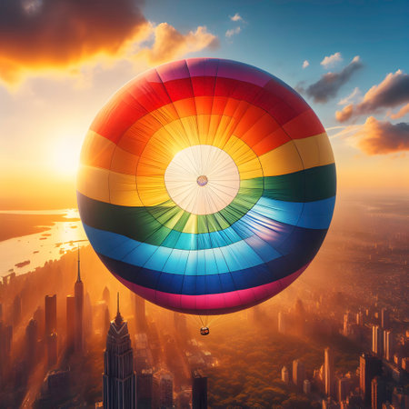 Vibrant Balloons Over Urban Skyline at Sunset