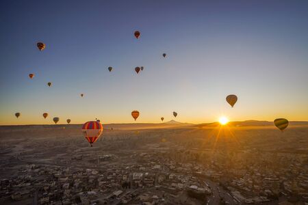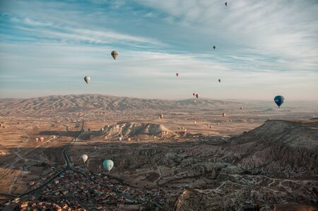 CAPPADOCIA, TURKY - 19 December 2019 : Aerial beautiful landscape view of balloons flight in the morning with sunrise sky background