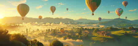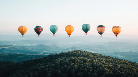A breathtaking scene of vibrant hot air balloons soaring above lush mountains at sunrise, showcasing adventure and tranquility in nature.
