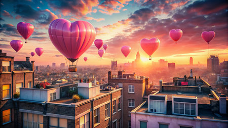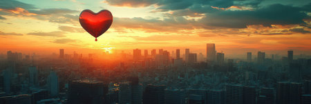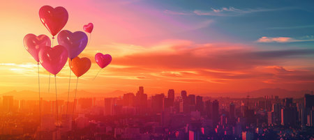 Valentines Day Banner with Heart Balloons Over City Skyline at Vibrant Sunset for Promotions
