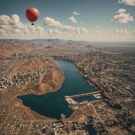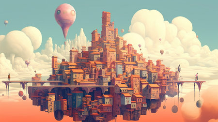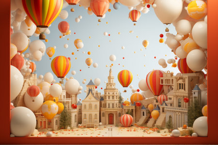 A vibrant hot air balloon hovers over a charming miniature town, creating a whimsical and playful atmosphere, perfect for inspiring creativity and adventure.