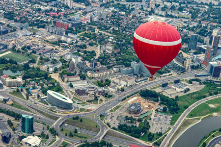Red balloon flying over the Vilnius city center. Cloudy day