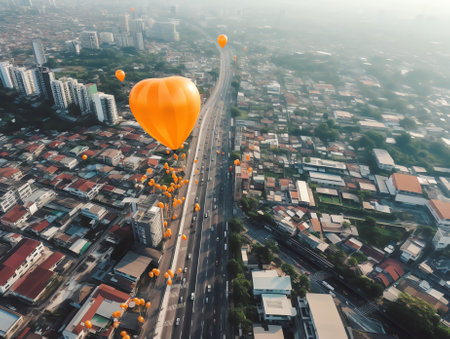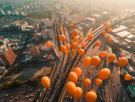 Colorful balloons float above a city street, creating a festive atmosphere in an urban setting