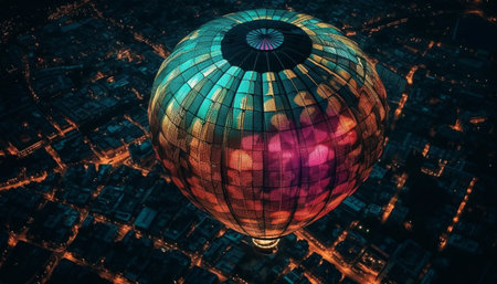 A hot air balloon with a vibrant design floats above a city illuminated by streetlights. The dark sky above the city contrasts with the warm glow of the lights below