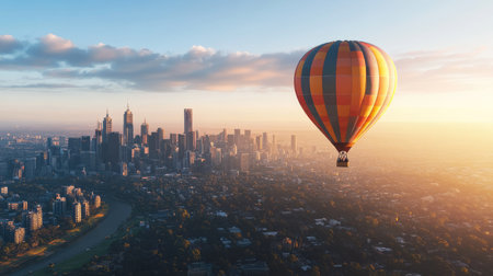 A vibrant hot air balloon soars above a sprawling cityscape at sunrise, surrounded by soft clouds. This breathtaking aerial view captures the tranquility and beauty of urban adventure.