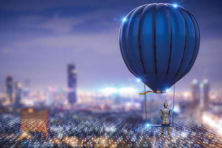 3d rendering robot on blue hot air balloon with swing fly in city
