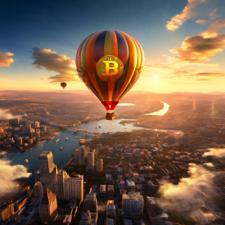 Bitcoin-themed hot air balloon soaring over cityscape at sunset