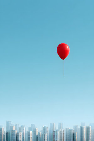 A vibrant red balloon is suspended in the air above a contemporary city skyline, creating a striking visual contrast with the clear blue sky
