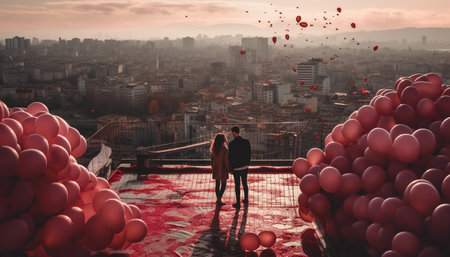 Love soars high in the city skyline with hot air balloon generated by artificial intelligence