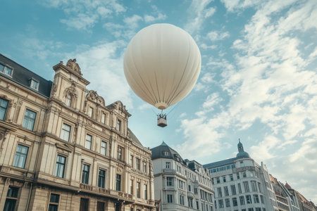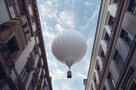 A large hot air balloon floats serenely between tall buildings, casting a gentle shadow on the urban streets below as clouds drift by in the bright afternoon sky.