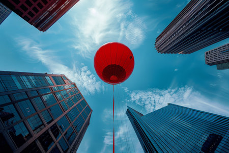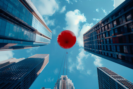 A large red balloon hovers high above, suspended between towering skyscrapers, set against a bright blue sky with wispy clouds, creating a striking cityscape.