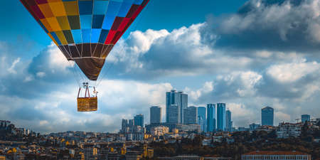 Colorful hot air balloon flying in the sky over the city.